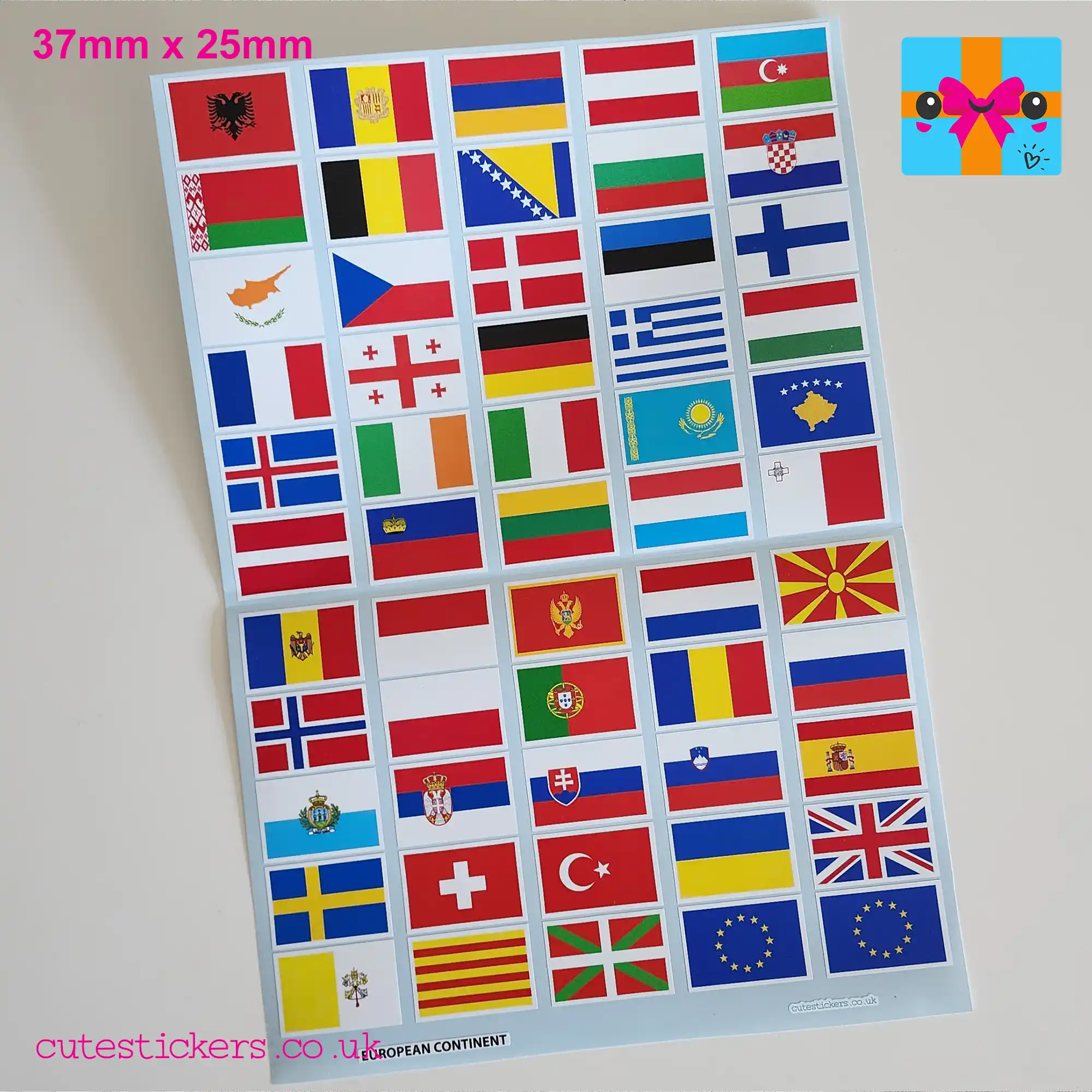 European Continent Country Flag Stickers. These stickers are permanent on paper. Removable on smooth surfaces. Please be aware that the longer they are stuck to a surface, the harder they will be to remove.