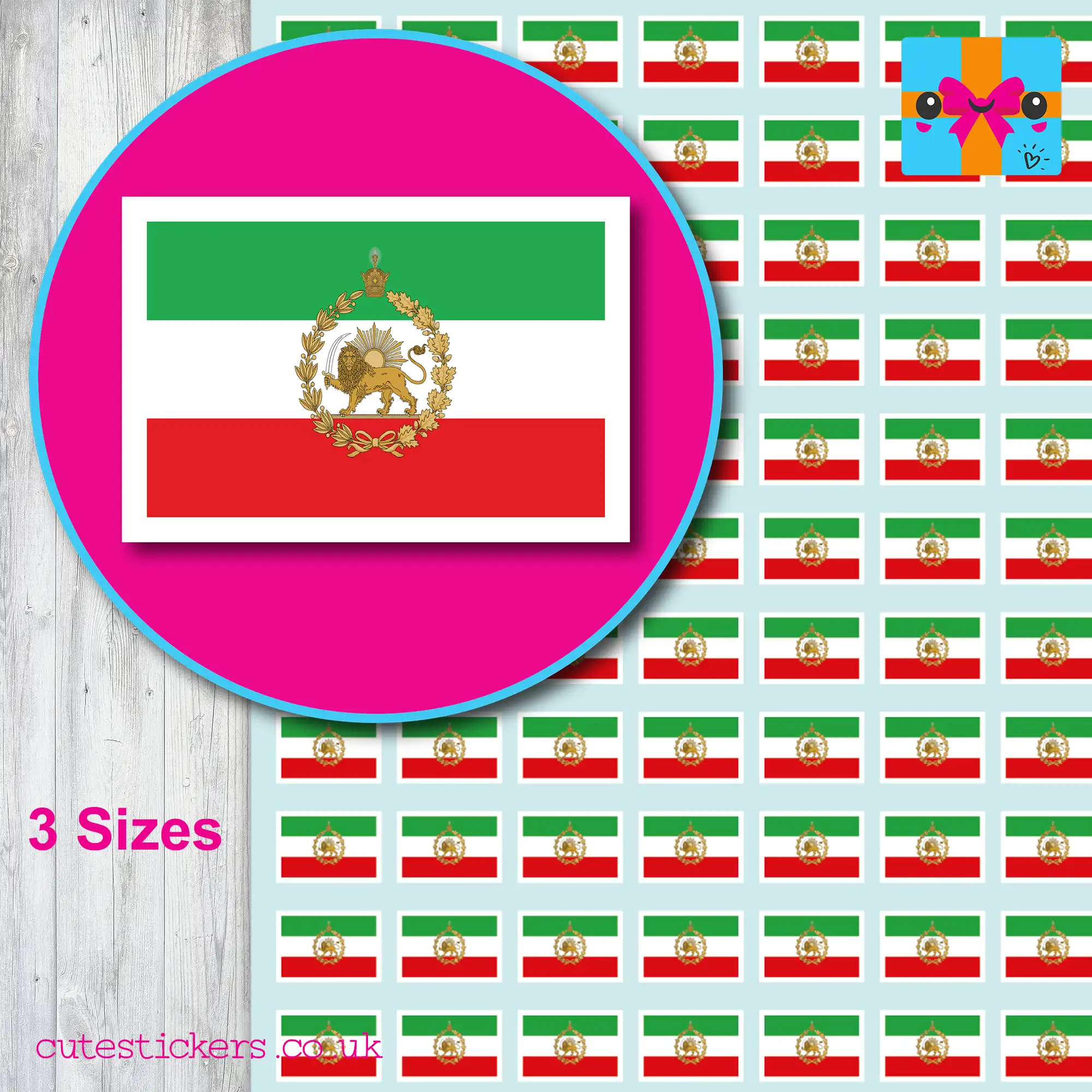 Iran Iranian Lion and Sun Flag Stickers. These stickers are permanent on paper. Removable on smooth surfaces. Please be aware that the longer they are stuck to a surface, the harder they will be to remove.