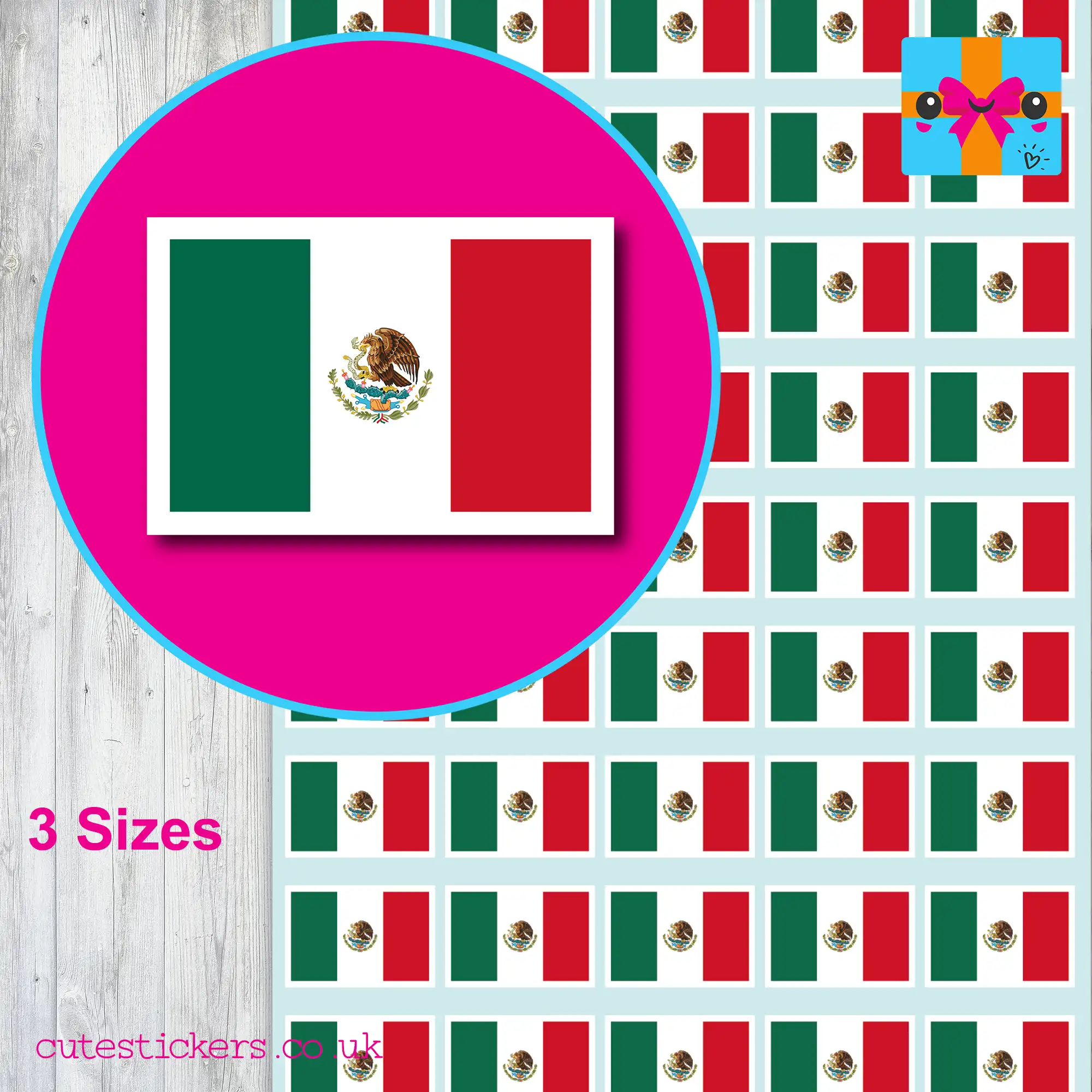 Mexico Mexican Flag Stickers. These stickers are permanent on paper. Removable on smooth surfaces. Please be aware that the longer they are stuck to a surface, the harder they will be to remove.